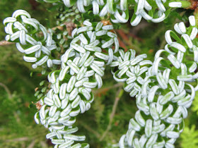 This one was completely new to me. It's Korean fir, Abies koreana, variety 'Horstman's Silberlocke.' The needles recurve so you can see the white underside. It was stunning. I looked it up and read that it also has large blue-purple erect cones in season. I don't know how you can go wrong if you want an ornamental conifer.